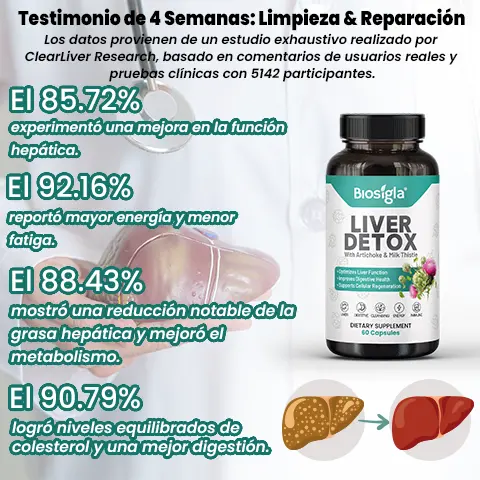 Dile adiós a los síntomas del hígado graso y hola a una energía renovada, una piel radiante y una pérdida de peso sin esfuerzo. Con Biosigla, no solo estás limpiando tu hígado, sino que estás transformando tu salud. Resultados visibles en tan solo 4 semanas: ¡siente la diferencia o te devolvemos tu dinero!