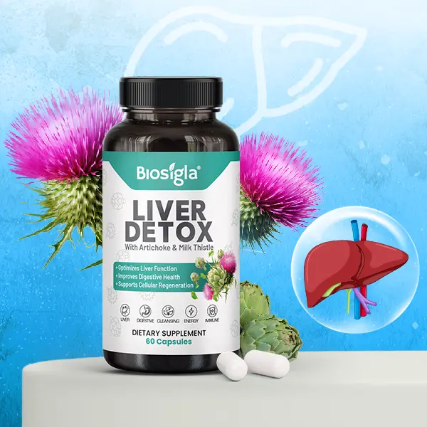 Las cápsulas herbales Biosigla - Liver Detox se absorben fácilmente en el cuerpo, aportando potentes ingredientes naturales directamente al hígado. El cardo mariano y la alcachofa actúan sinérgicamente para mejorar la desintoxicación hepática, reducir la grasa hepática y promover la producción de bilis, lo que ayuda a eliminar toxinas y mejorar la digestión. Estas hierbas ayudan a acelerar el metabolismo, equilibrar los niveles de colesterol y regular el azúcar en sangre, lo que las hace esenciales para la salud hepática general. Al favorecer la regeneración hepática y reducir la inflamación, Biosigla - Liver Detox ayuda a mejorar la función hepática, combatir la enfermedad del hígado graso y apoyar los procesos naturales de desintoxicación del cuerpo, dejándote con más energía, una piel más limpia y una mejor salud general.