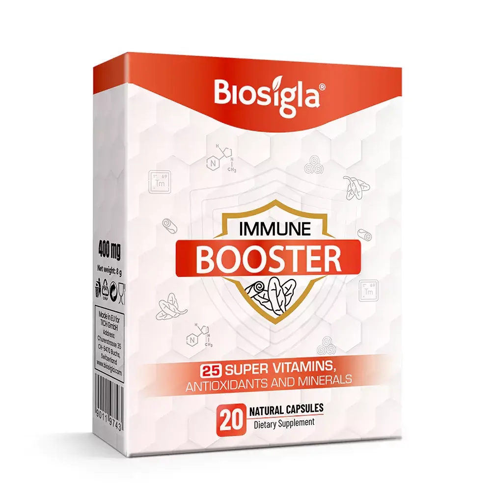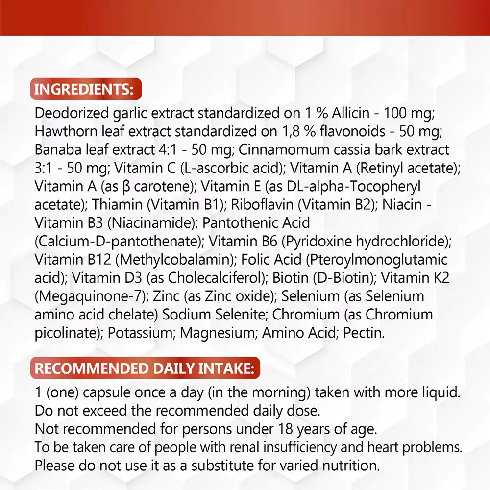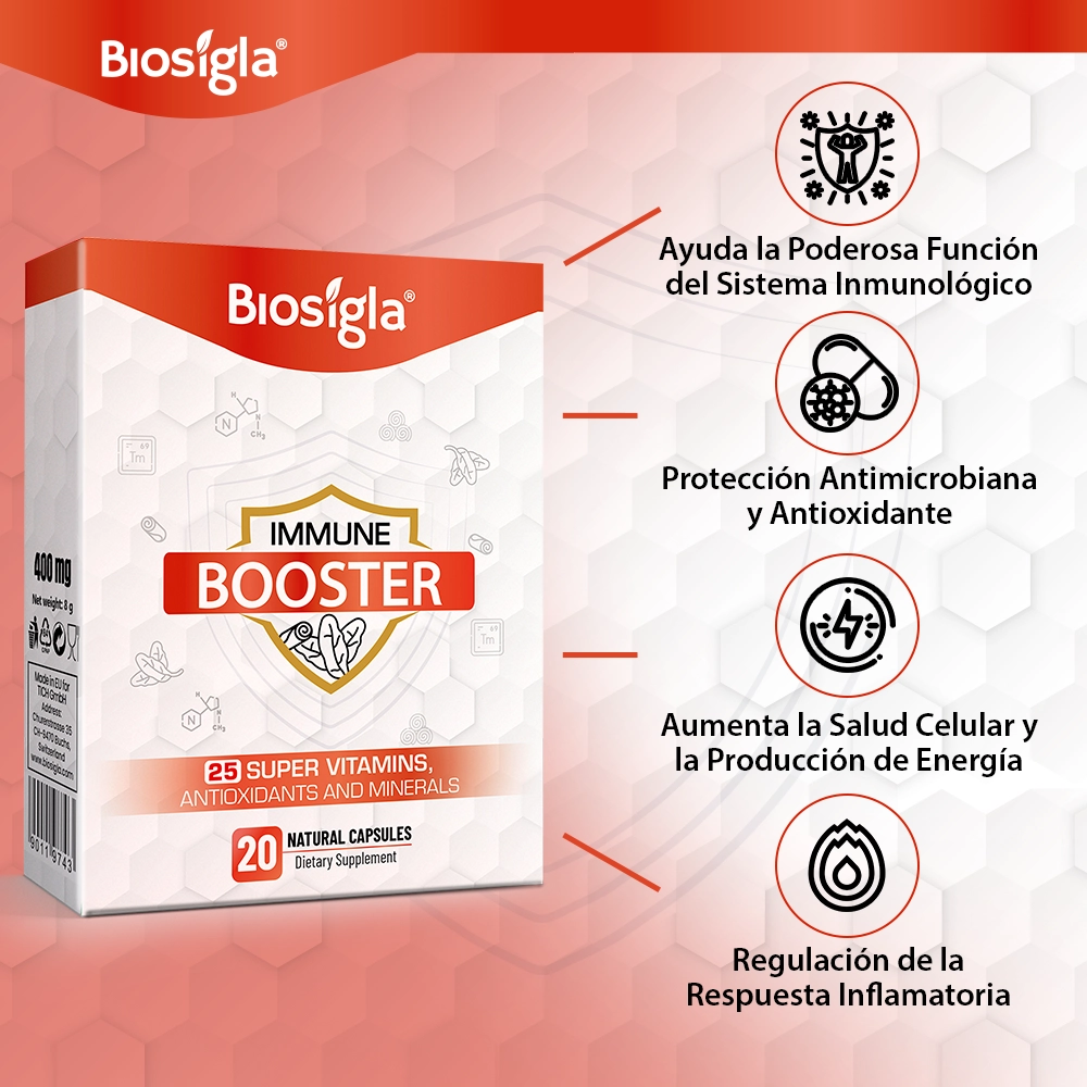 Immune Booster contiene una mezcla de ingredientes cuidadosamente seleccionados, cada uno elegido por sus beneficios específicos: vitamina C, vitamina A, vitamina E, vitaminas B (B1, B2, B3, B6, B12, ácido fólico), zinc, selenio, vitamina D3, Magnesio, Calcio, Potasio, Ajo, Extracto de Hoja de Banaba, Extracto de Corteza de Cinnamomum Cassia, Biotina, Pectina y Aminoácidos.