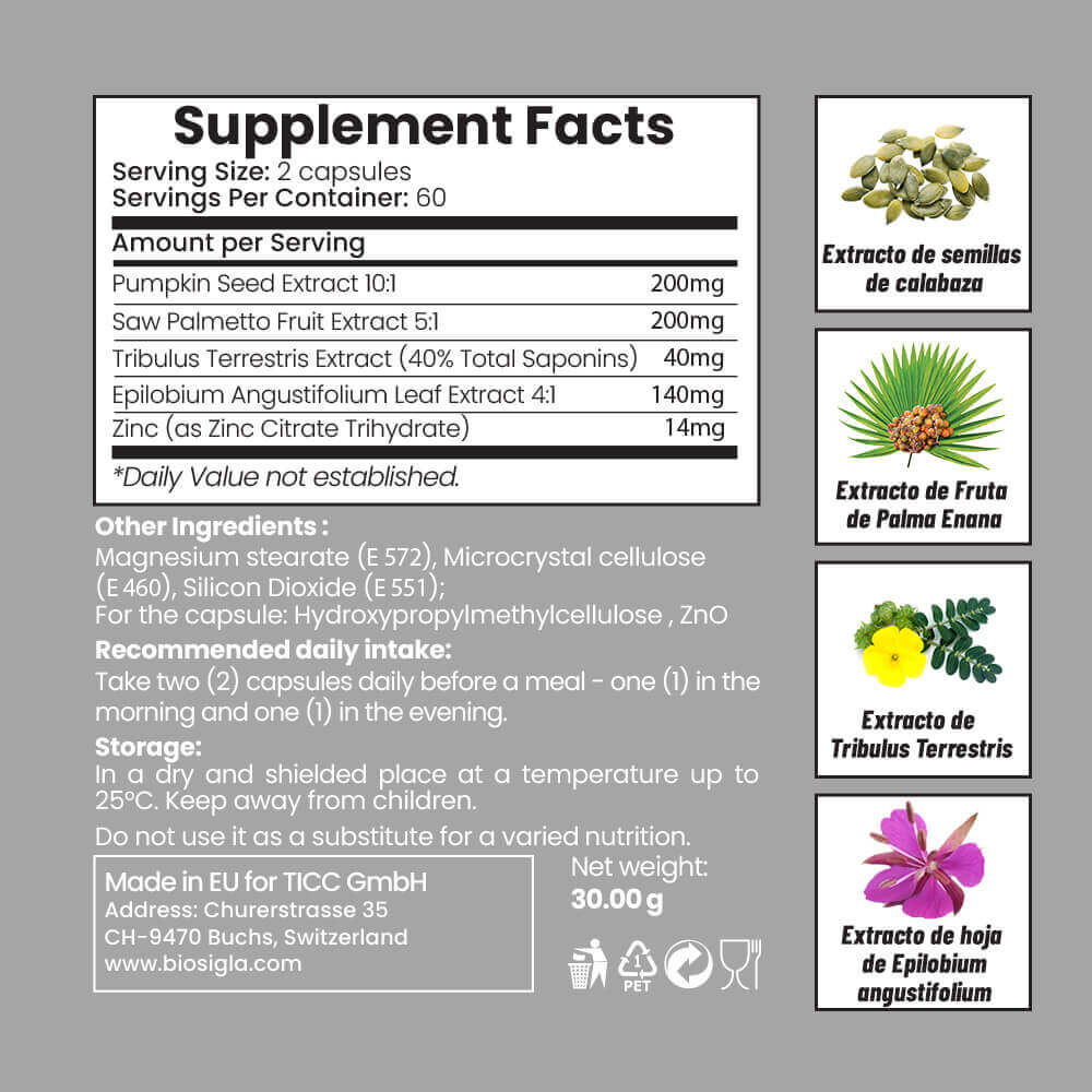 La Palma Enana, el Tribulus Terrestris y las Semillas de Calabaza han sido reconocidos por su efecto positivo en la salud reproductiva masculina y por apoyar la función saludable de la próstata.